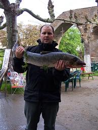 Truchón de 80 cm tremendo, el 10.02.2011 con ninfa e hilo del 14. Unos 5 kg más o menos. |